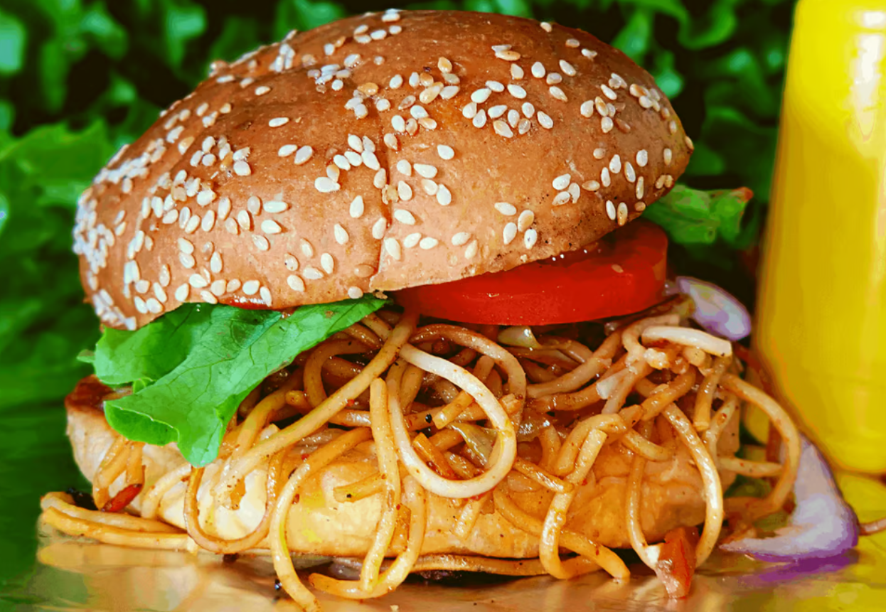 ✔ Veggie Noodle Burger – Crispy vegetable pattie with spicy masala noodles